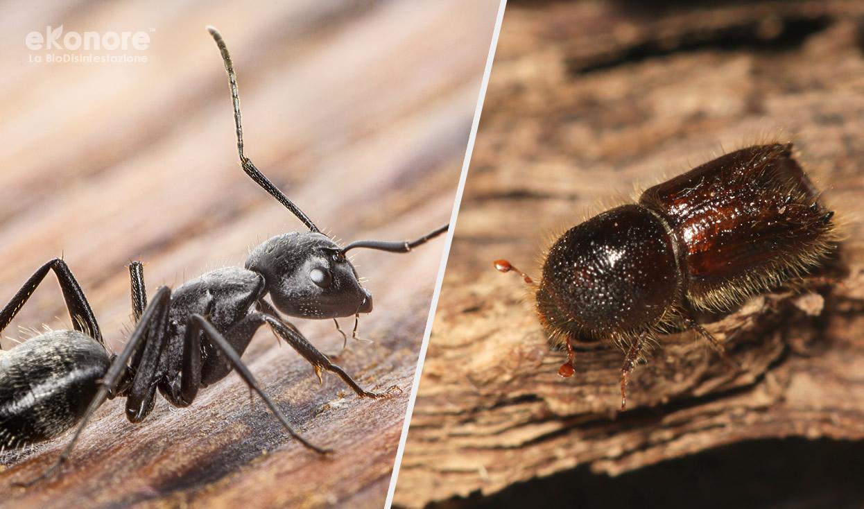 Non di rado può capitare di confondere gli effetti dei danni provocati dai tarli del legno da quelli causati dalla Camponotus ligniperda, meglio conosciuta come formica carpentiere. In realtà la sua “modalità di azione” è profondamente diversa da quella dei tarli. Se è vero che anche la formica carpentiere scava gallerie nel legno, a differenza dei tarli non se ne nutre: nel suo caso le gallerie scavate servono solo a creare il nido e i passaggi per produrre vie d’uscita verso altri nidi. La sua attività di scavo può produrre seri danni alle strutture in legno e una sorta di segatura molto fine. Quando attaccano il legno, le formiche lo sgretolano con le loro mandibole. Ecco perché la differenza guardando una trave invasa dalle formiche e una attaccata dai tarli è piuttosto evidente: nei nidi delle formiche del legno i passaggi sono levigati e puliti, privi di frammenti e rosume. Così come per i tarli, però, anche la lotta alle formiche del legno deve essere eseguita da tecnici qualificati con metodi efficaci, non residuali e non tossici. Come quelli proposti da Ekonore.